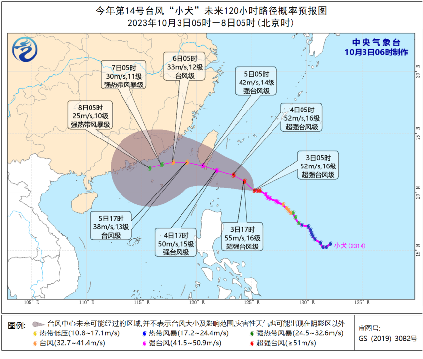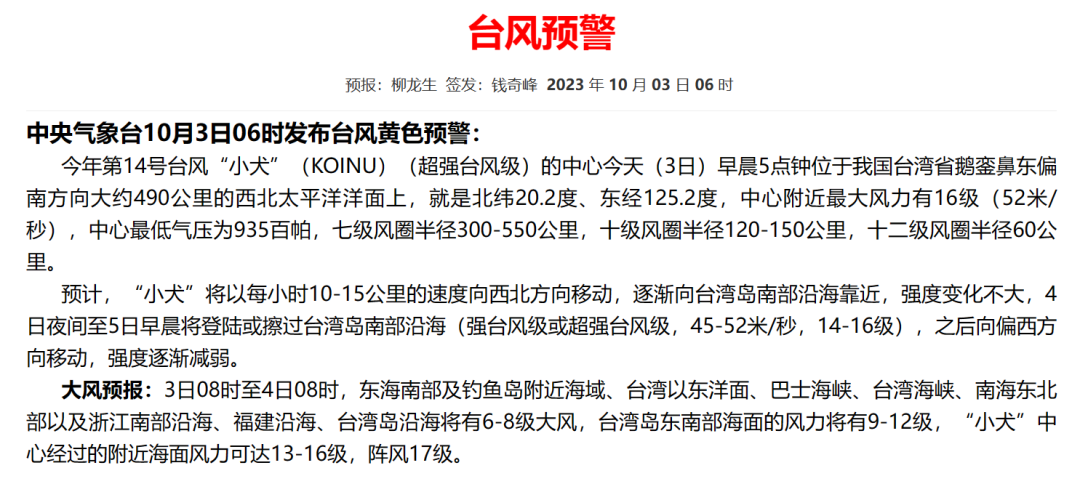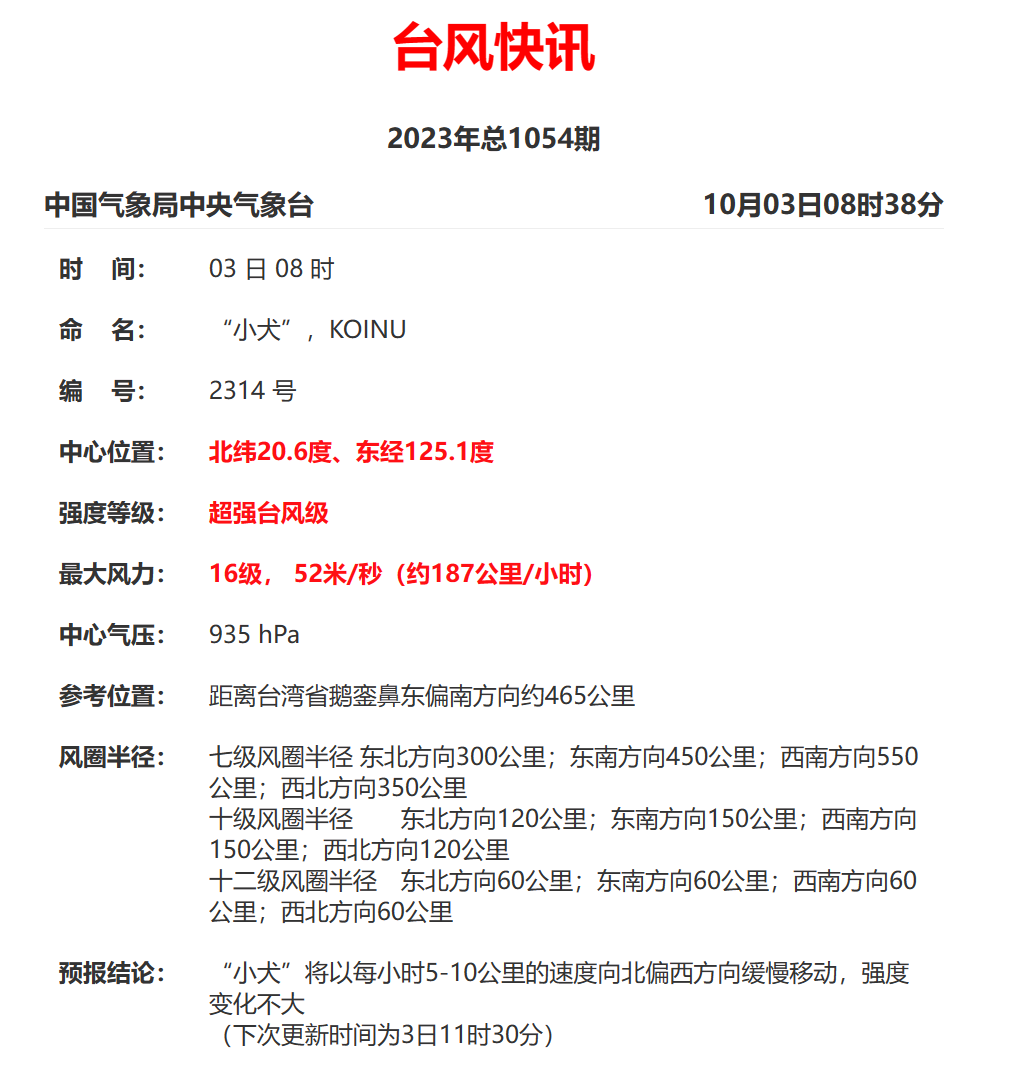 据中央气象台今天(10月3日)8时消息今年第14号台风“小犬”已经达到超强台风级其中心位于北纬20.6度、东经125.1度中心附近最大风力16级