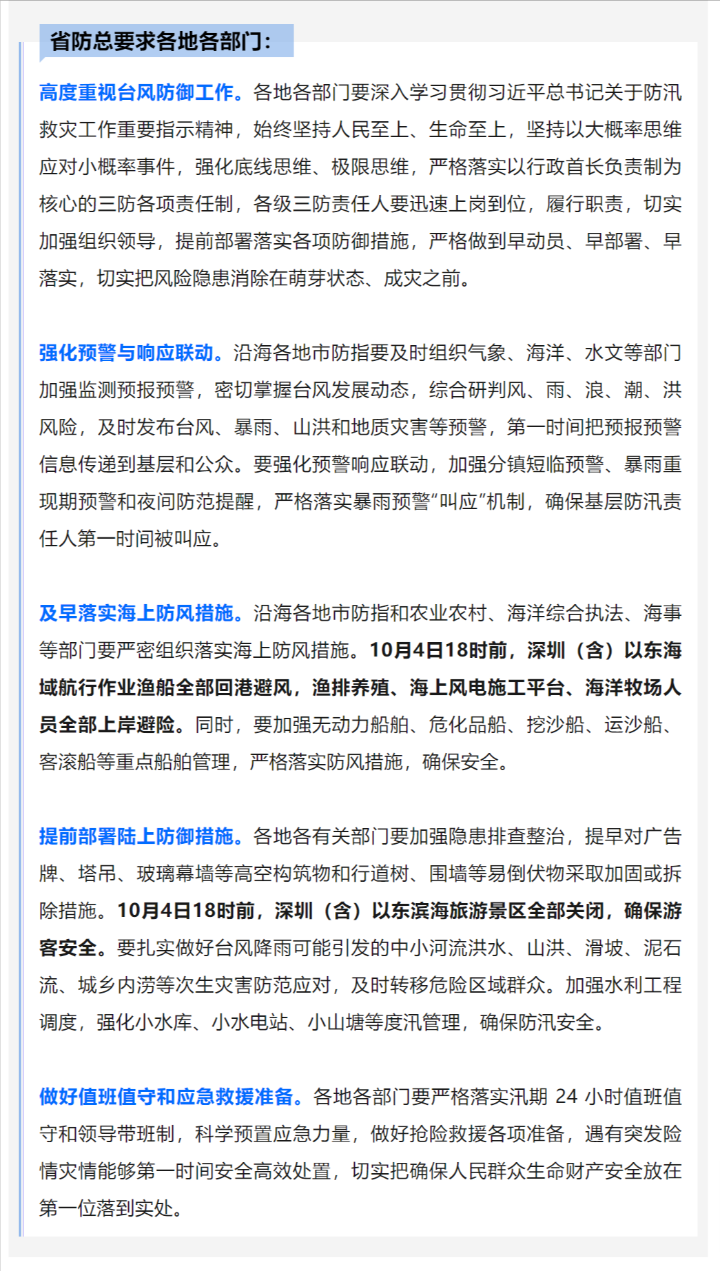 据“广东应急管理”10月2日23时许消息,广东省防总发布通知称,各地各有关部门要加强隐患排查整治,提早对广告牌、塔吊、玻璃幕墙等高空构筑物和行道树、围墙等易倒伏物采取加固或拆除措施。10月4日18时前,深圳(含)以东滨海旅游景区全部关闭,确保游客安全。要扎实做好台风降雨可能引发的中小河流洪水、山洪、滑坡、泥石流、城乡内涝等次生灾害防范应对,及时转移危险区域群众。加强水利工程调度,强化小水库、小水电站、小山塘等度汛管理,确保防汛安全。