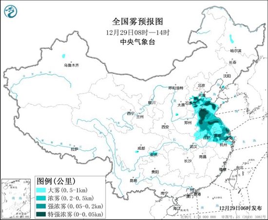 此外,预计今天早晨至上午,河北东南部、山东大部、河南东部、安徽中北部、江苏、上海、浙江北部、重庆西部等地的部分地区有大雾,其中,河北东南部、山东中西部、安徽北部、江苏北部和东部、上海南部等地的部分地区有能见度低于200米的强浓雾,河北东南部、山东中西部、江苏北部和东南部、安徽北部等地的部分地区有能见度低于50米的特强浓雾。中央气象台今晨升级发布大雾红色预警。