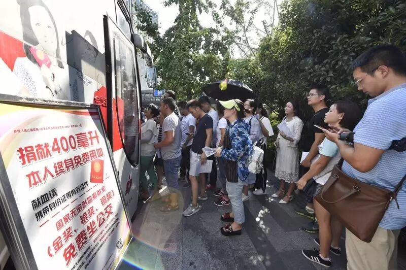 得知伤员用血量大的消息后,尽管21日当天杭州气温高达近40℃,但还是有不少人顶着高温来到各个献血点献血。不少在高温中工作的环卫工人、快递小哥也投入到了献血的行列当中。