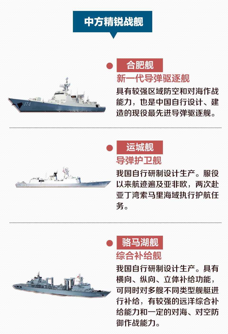 相比起之前几次演习,虽然两国在本次演习中派出的兵力并不是很多,但参演战舰却都是双方的精锐力量。中方舰艇编队的3艘舰艇合肥舰、运城舰和骆马湖舰分别是中国非常现代化的导弹驱逐舰、导弹护卫舰以及远洋综合补给舰。而俄方也派出了其新一代护卫舰——勇敢舰和守护舰。