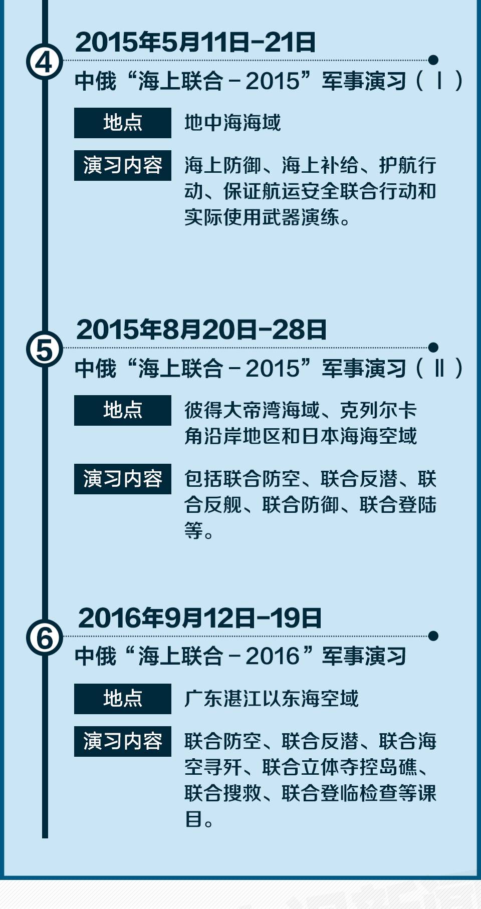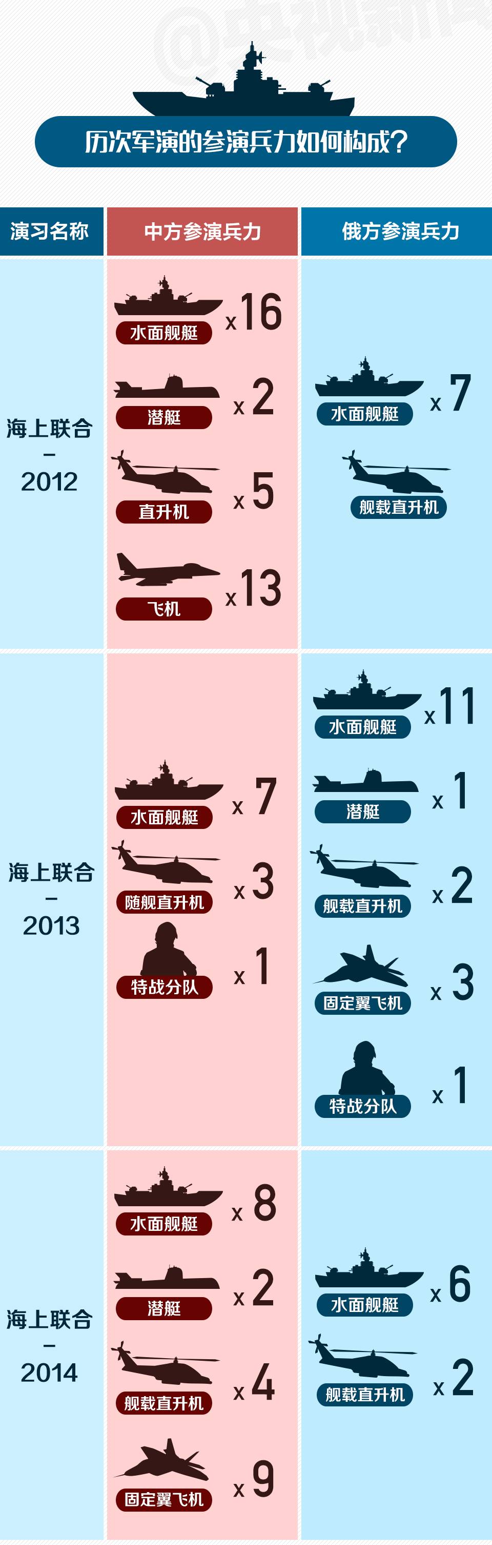 从2012年开始,中俄两国轮流在自己国家及附近海域举办联合军演,每年都会举行至少1场海上联合演习。自2012年开始,两国已经举办了6次海上演习(不包括今年这次)。