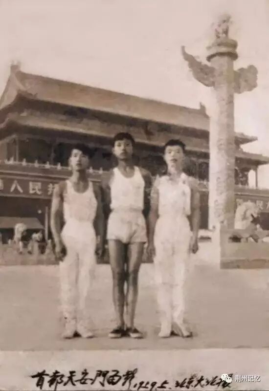 来自荆州的三名少年体操健儿宋勤学、黄大荣、曾贤正都是第一次来到首都北京,他们深感一路拼搏不易,三人约好来到天安门广场合影,留下了永生难忘、风华正茂的集体照。