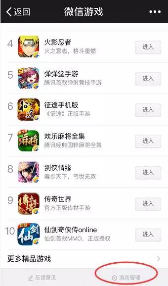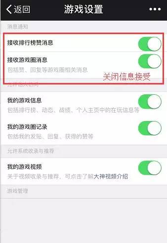 同样是进入微信后,依次点击 【发现】—【游戏】,下拉网页到底,点击页面底部的【游戏管理】图标(有的手机是直接选择右上角的游戏设置按钮)—然后分别将「接收排行榜赞消息」以及「接收游戏圈消息」关闭即可。