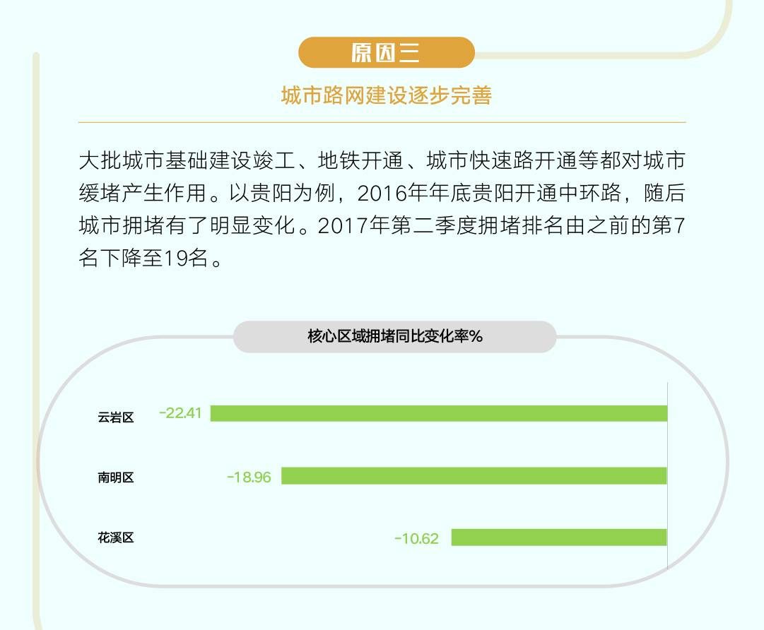 大批城市基础建设竣工、地铁开通、城市快速路开通等都对城市缓堵产生作用。报告显示,2016年年底,贵阳开通中环路,城市拥堵有了明显变化。2017年第二季度出行高峰拥堵程度相比去年同期下降6.11%,拥堵排名也由之前的第7名下降至19名。