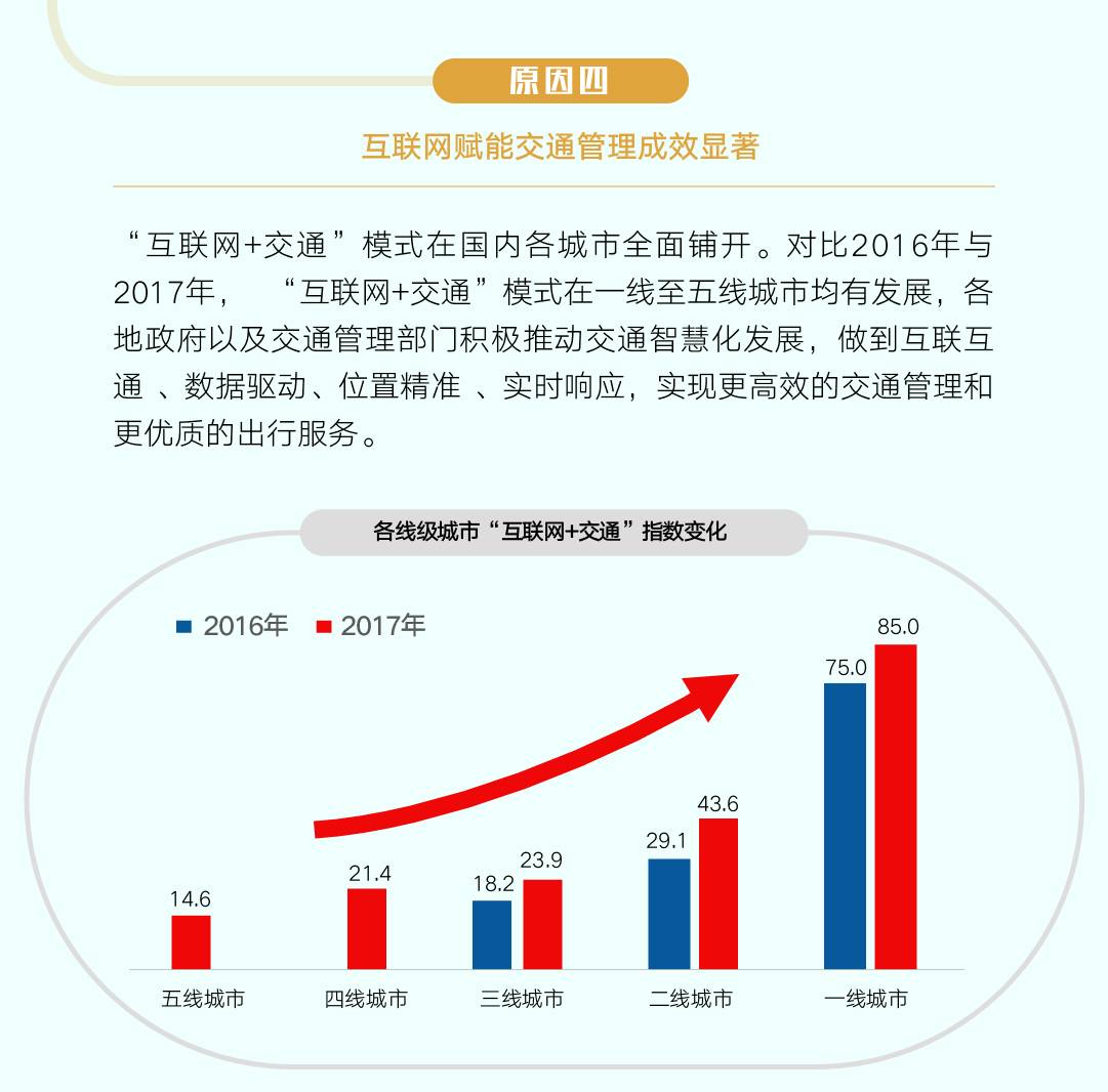 对比2016年与2017年两年“互联网+交通”城市指数可以发现,“互联网+交通”模式在一线至五线城市均有发展,各地政府以及交通管理部门逐渐重视并积极推动交通智慧化发展,做到了互联互通 、数据驱动、位置精准、实时响应,实现了更高效的交通管理和更优质的出行服务。