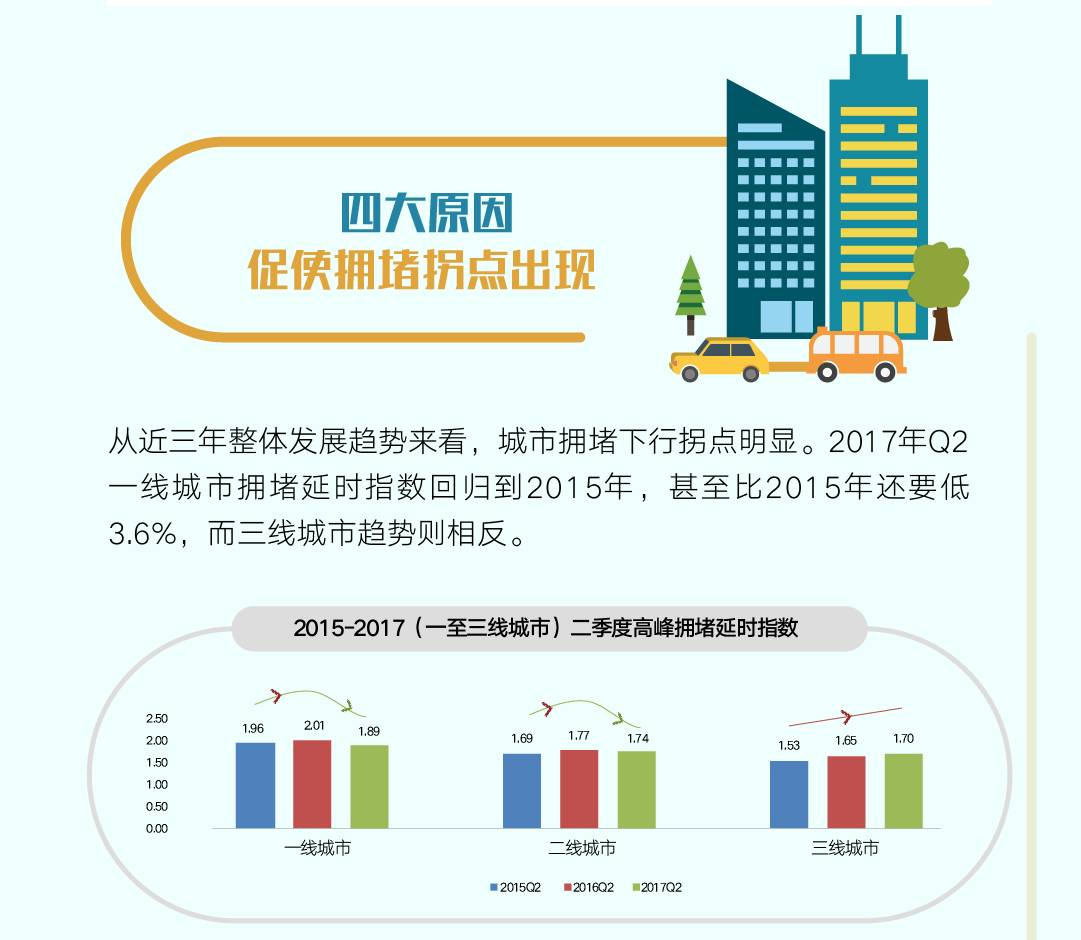 △从近三年的数据来看,2016Q2是一线与二线城市拥堵峰值,2017Q2指数分别出现下降的趋势。从整体发展趋势来看,城市拥堵出现2014年以来首个下行拐点。2017Q2一线城市拥堵延时指数回归到2015年,甚至比2015年还要低3.6%,降幅十分突出,而三线城市趋势则相反。