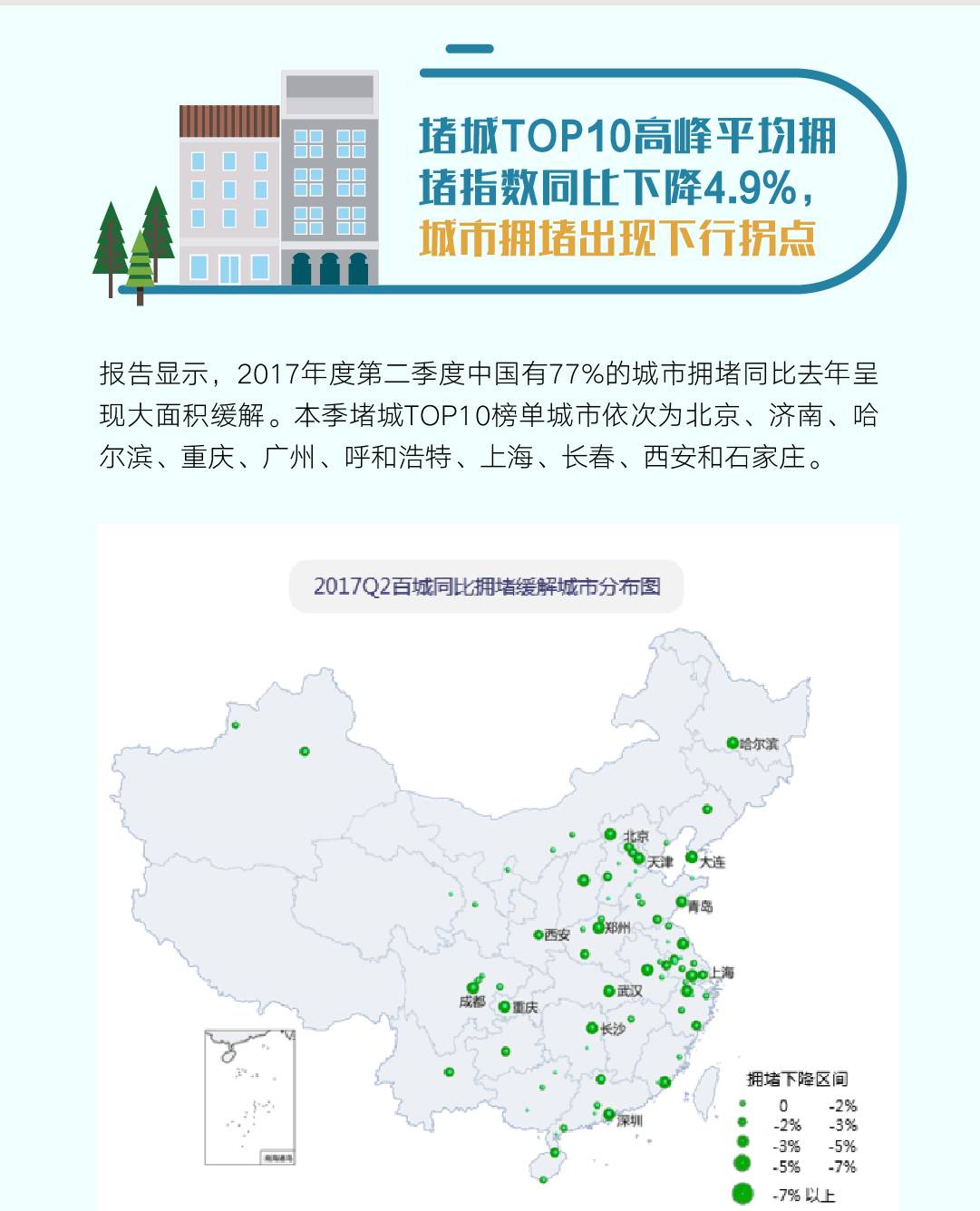 报告显示,2017年度第二季度中国堵城排行榜在监测的100城市中,有77%的城市拥堵同比去年呈现大面积缓解。