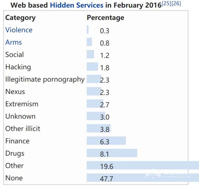 根据维基百科上Dark web里的相关数据表明,暗网作为逃避网络监管的安全场所,充斥着军火、毒品、色情和诈骗等非法交易。