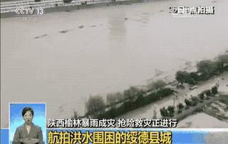 从绥德县的航拍画面上看,整个县城基本上已经被洪水漫盖,大部分车辆的引擎盖已经被洪水淹没,河道水位已经涨到河堤的高度,漫到了河两边的道路。