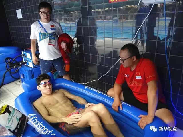热身池边,每支游泳队都有一个冰疗浴槽,各路选手纷纷“冰镇”,中国队的设备仿佛为孙杨“专供”,只有他一个人在频繁使用,室外和泳池水的温度在25摄氏度左右,冰疗浴槽水温设定在13度,有时候低到9度。他在比赛后放松时,不停在泳池常温的水和冷水里转换,能够帮助他祛除堆积的血乳酸,帮助他在接下来的比赛中发挥神勇。