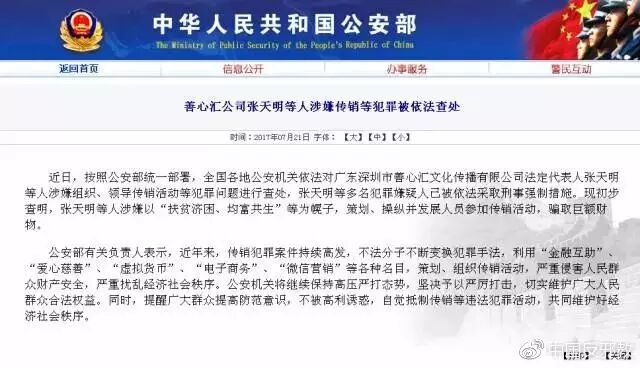 近日,按照公安部统一部署,全国各地公安机关依法对广东深圳市善心汇文化传播有限公司法定代表人张天明等人涉嫌组织、领导传销活动等犯罪问题进行查处,张天明等多名犯罪嫌疑人已被依法采取刑事强制措施。