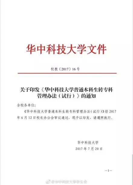 近日,据@华中科技大学学生会和@武汉校园 爆料,华中科技大学通过了《华中科技大学普通本科生转专科管理办法(试行)》。这份文件的落款日期为7月20日: