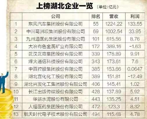 如上表,湖北省有13家企业上榜今年的《财富》中国500强,比去年的14家少一位。