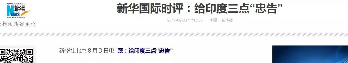 新华社8月3日下午发表题为“给印度三点‘忠告’”的时评文章,“一是希望印度不要强词夺理,不要胡搅蛮缠;二是希望印度尽快老老实实退回去;三是希望印度不要执意挑衅中国,与中国为敌没有好下场。”