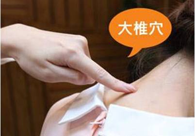取穴:人体的颈部下端,第七颈椎棘突下凹陷处。若突起骨不太明显,让患者活动颈部,不动的骨节为第一胸椎,约与肩平齐。
