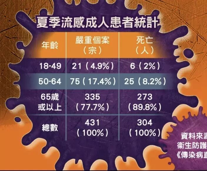 来自香港卫生署卫生防护中心的数据显示,自今年 5 月 5 日至 8 月 6日,香港共监测到 456例成人严重流感病例,包括 324例死亡,绝大部分属于甲型流感(H3)。其中65岁以上老人占多数,大部分病人有慢性病患,较易出现并发症甚至导致死亡; 19 例儿童(年龄小于 18 岁)流感相关的严重并发症病例中大部分为H3,其中3人死亡。大部分病人没有接种本季季节性流感疫苗。