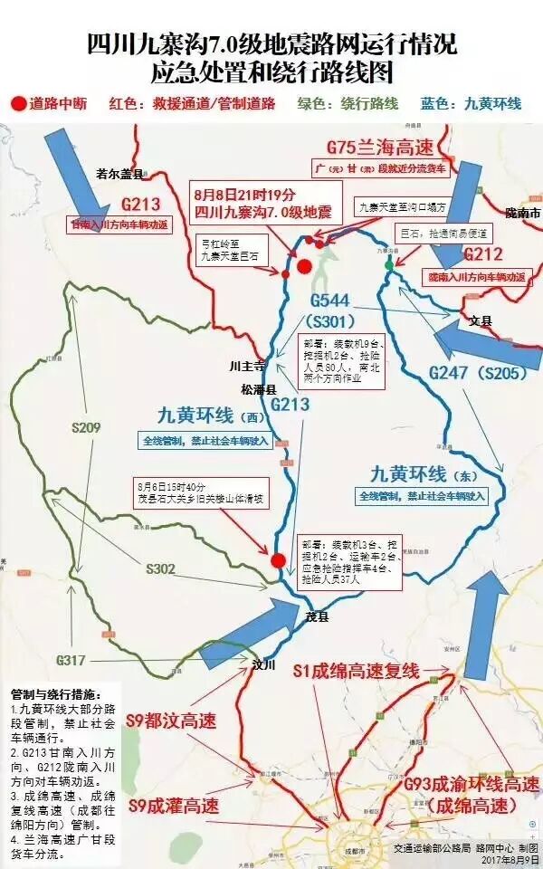 另据记者从交通运输部路网中心了解到,距离震中只有6公里的国道544(原省道301线),从九寨天堂酒店到九寨景区沟口有两处塌方,塌方现场边坡高,飞石不断,抢通难度大,需要在成都制作150米左右钢洞运输现场保通。截止9日上午10:50,九寨沟沟口至九寨天堂三处堵点,已有一处抢通简易便道。