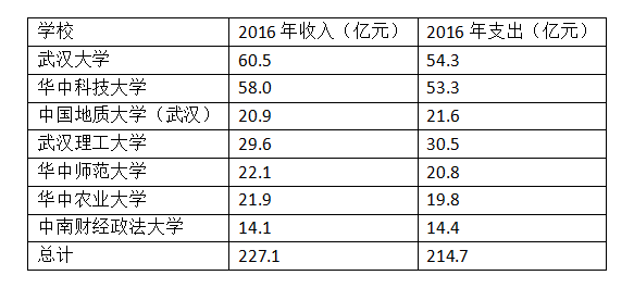 近日,75所教育部直属高校在官网公布了2016年度部门决算,记者梳理数据发现,湖北的7所部属高校2016年收入合计227亿元,其中武汉大学和华中科技大学分别是60.5亿元和58亿元,大大超过其他5所高校。