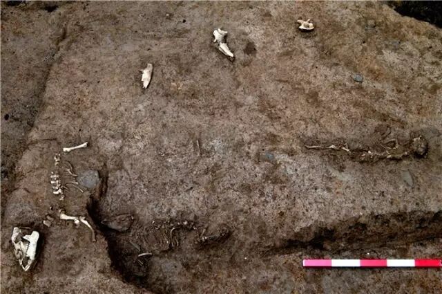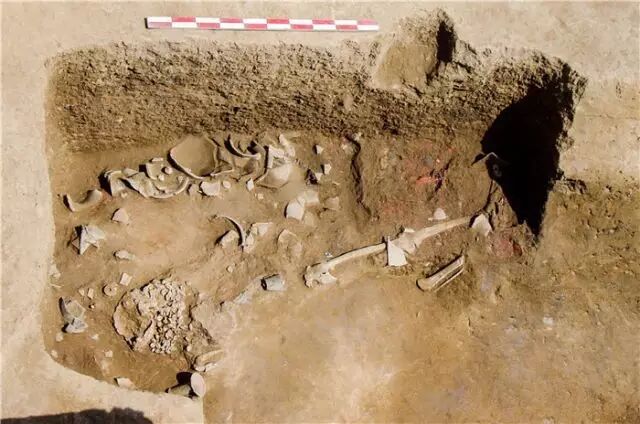 河南偃师二里头遗址1号巨型坑中用猪祭祀的遗迹(2010年11月28日摄)。新华社发