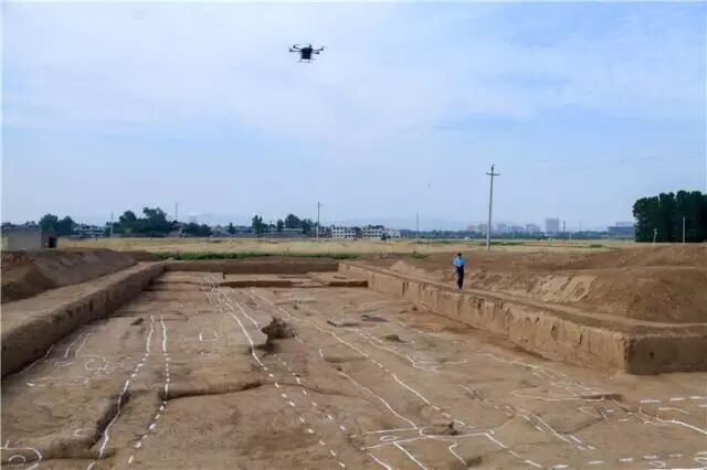 考古工作人员在河南偃师二里头遗址宫殿区发掘现场进行航拍(2015年5月22日摄)。 新华社发