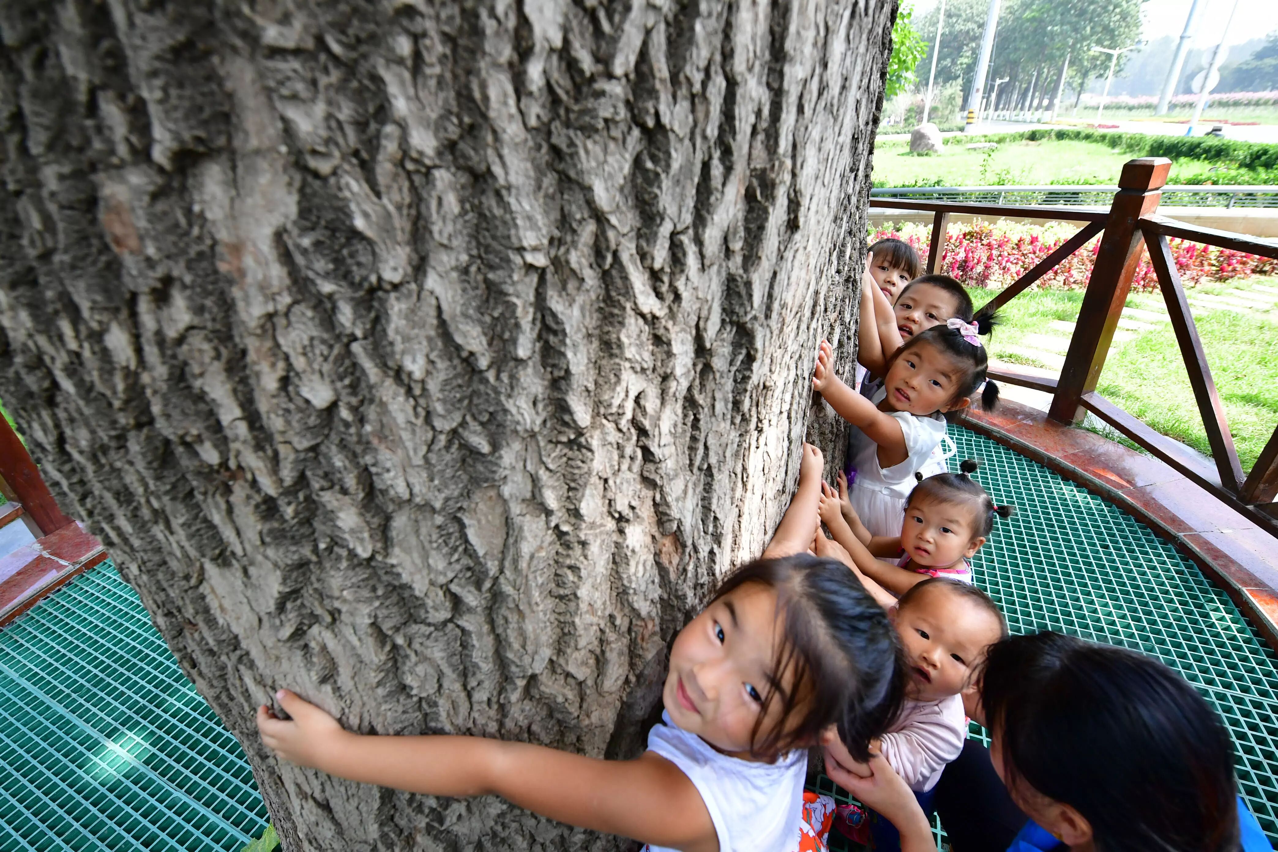 在河南省兰考县焦裕禄干部学院门口,小朋友在焦桐下玩耍(8月9日摄)。