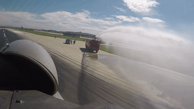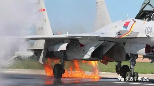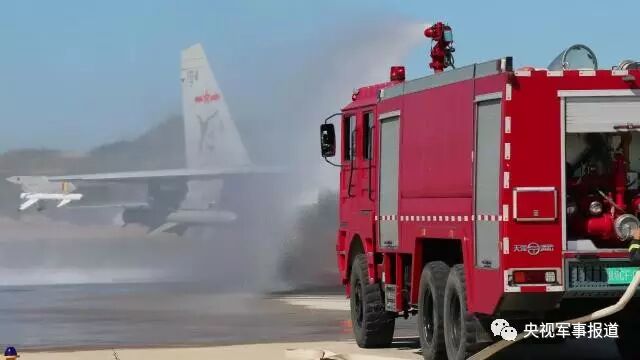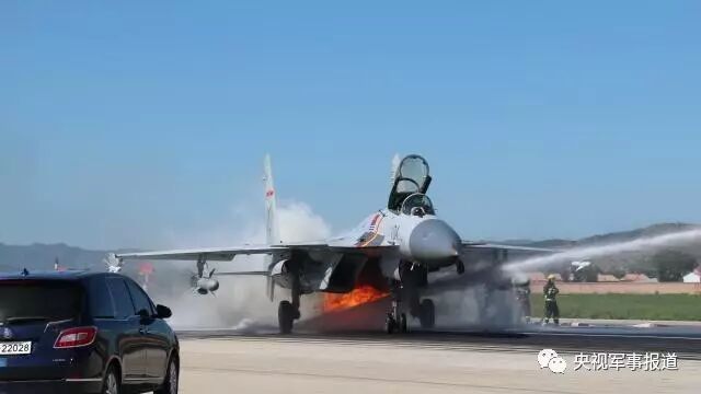 受损战鹰接地一瞬间,在外场保障的官兵驾驶各种地面救援车辆快速就位,紧急灭火扑救。