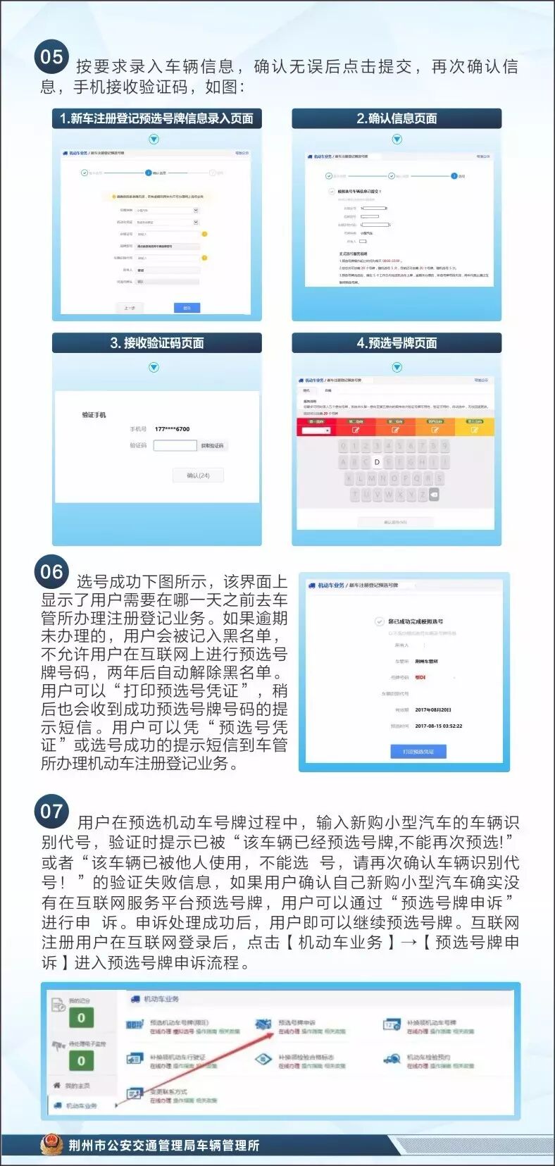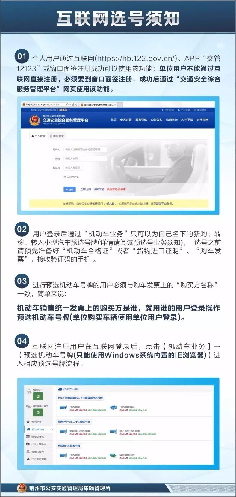 荆州车管所互联网选号须知 2017-08-19 14:41 荆州车管所 0 为了让群众享受到互联网带来的快捷,让更多的便民利民举措惠及千家万户,努力创造公开公平公正的选号环境,凡有新车注册登记和二手车预选号牌的车友可在实名注册开通互联网交通安全综合服务平台账号后,登录平台选取心仪号牌。