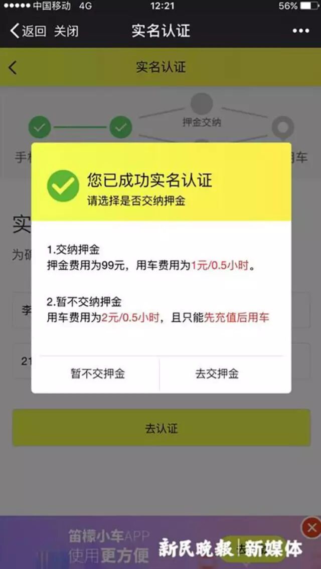 这辆黄色小车车身上贴有二维码,并写着“扫码一元用车”,右侧后轮安装有四位密码锁。尝试扫码,跟共享单车注册流程相似,需要手机注册和实名认证。实名认证后,则可选择是否交纳押金,按提示说明,两者在后续使用费用上存在差异,交纳99元押金后的使用价格便宜一些,半小时1元。