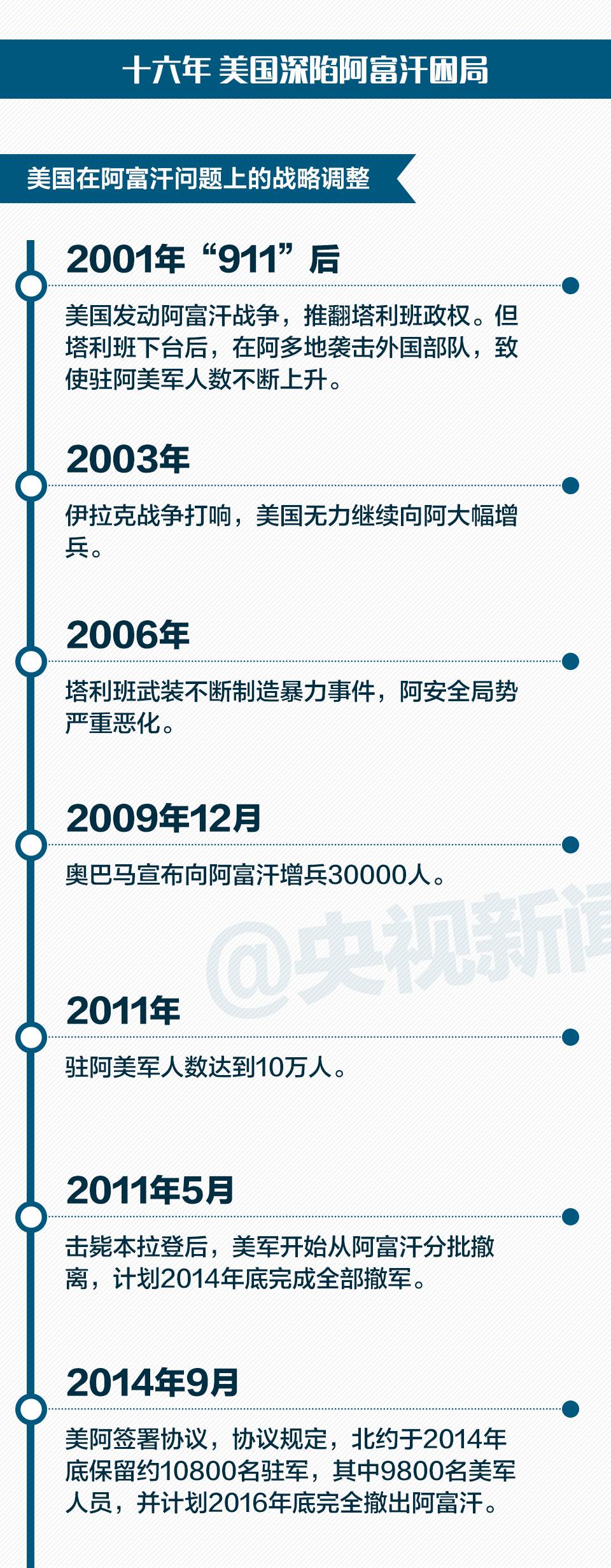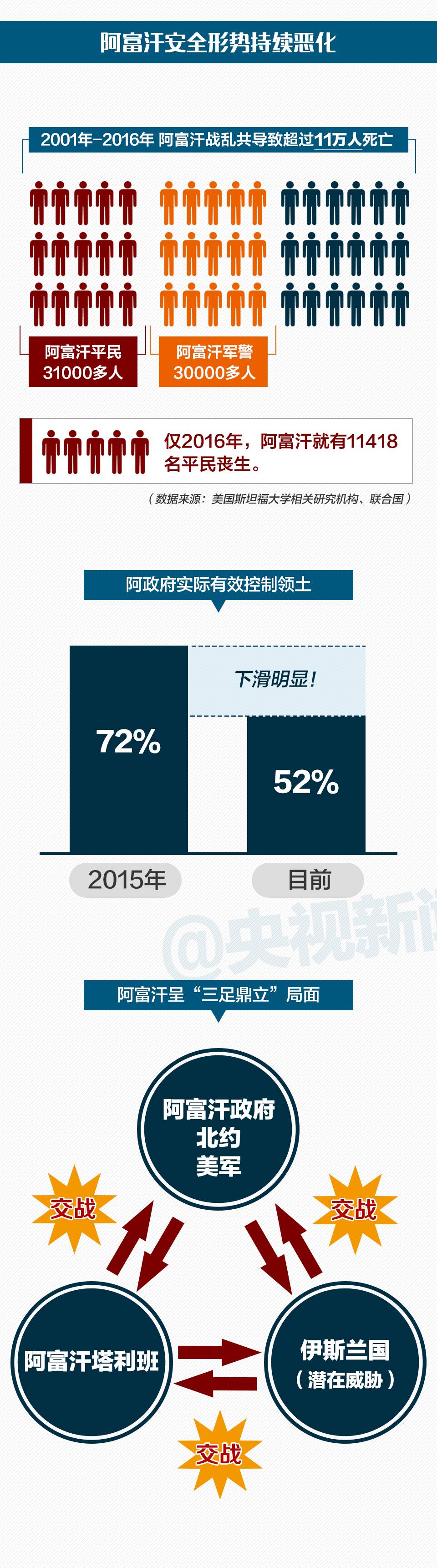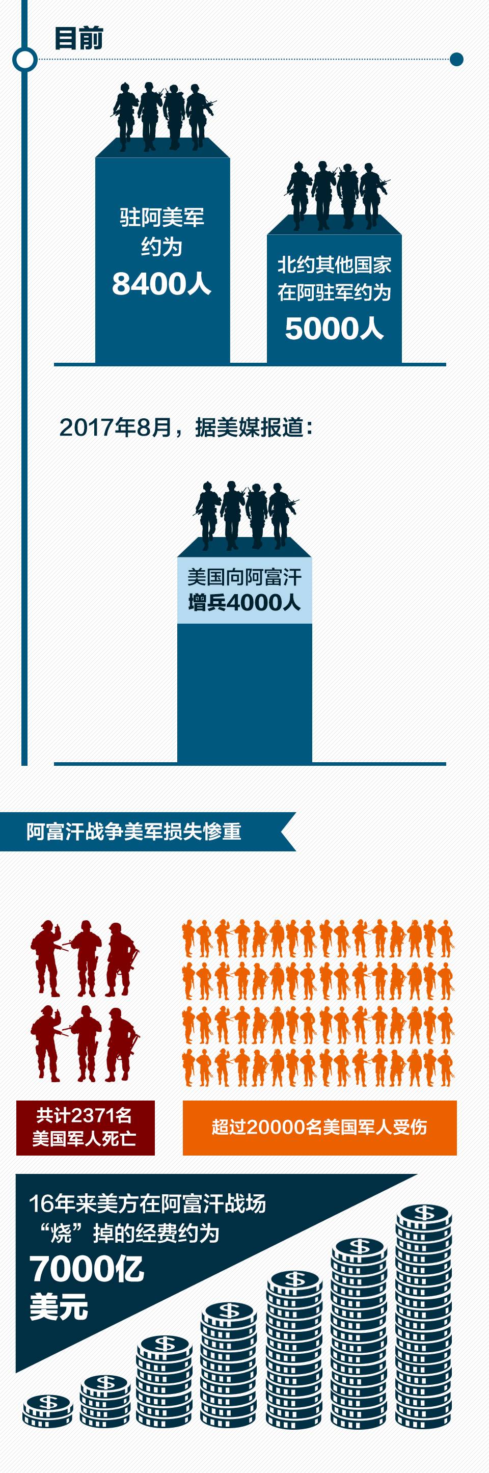 特朗普表示,阿富汗境内及该地区的恐怖分子对美国存在巨大威胁,美国从阿富汗迅速撤军的后果不可接受。演讲中,特朗普并没有过多谈及政策的具体内容,但据美媒报道,特朗普已签署政令,同意增派4000多名军人到阿富汗。