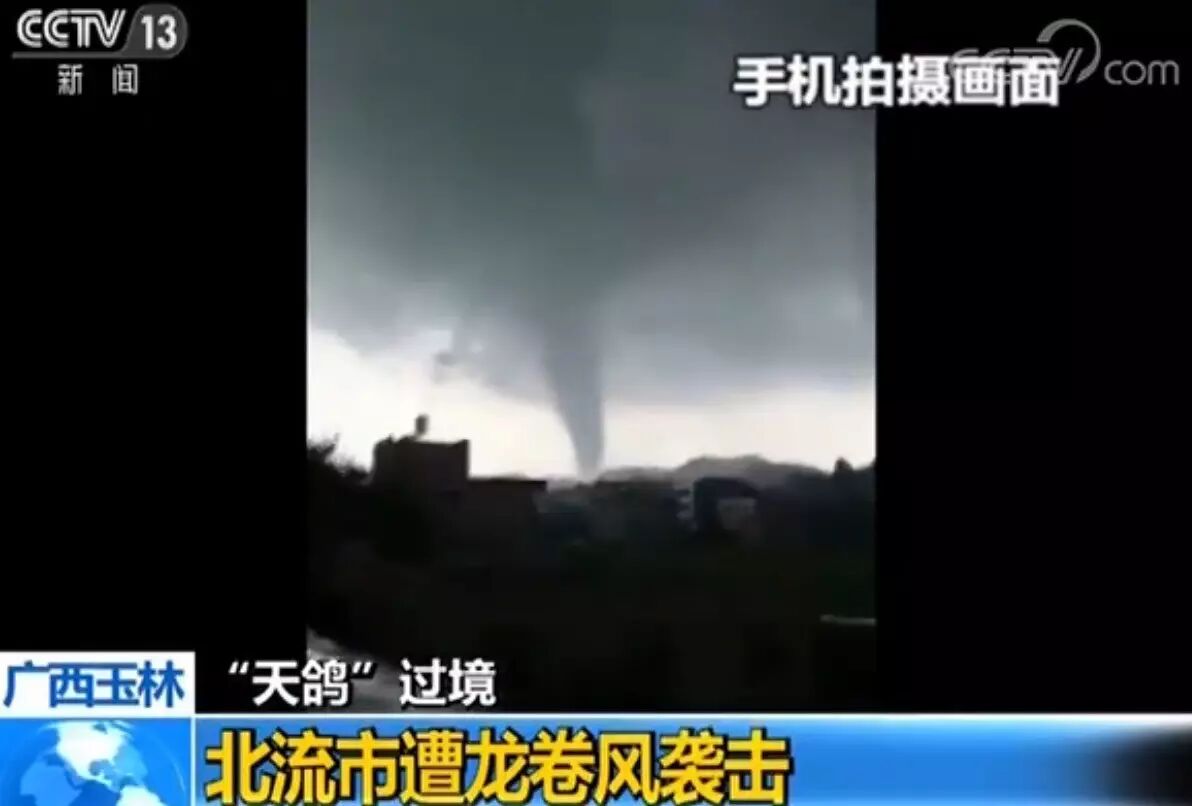 受台风“天鸽”带来的强对流天气影响,广西北流市秧道村遭受龙卷风袭击。从村民用手机拍摄的画面可 以看到,龙卷风掠过时,一条上百米的漏斗状云柱盘旋着快速移动,天空顿时黑压压的一片。龙卷风持续了约一分钟左右,有5人在此次龙卷风中受伤。