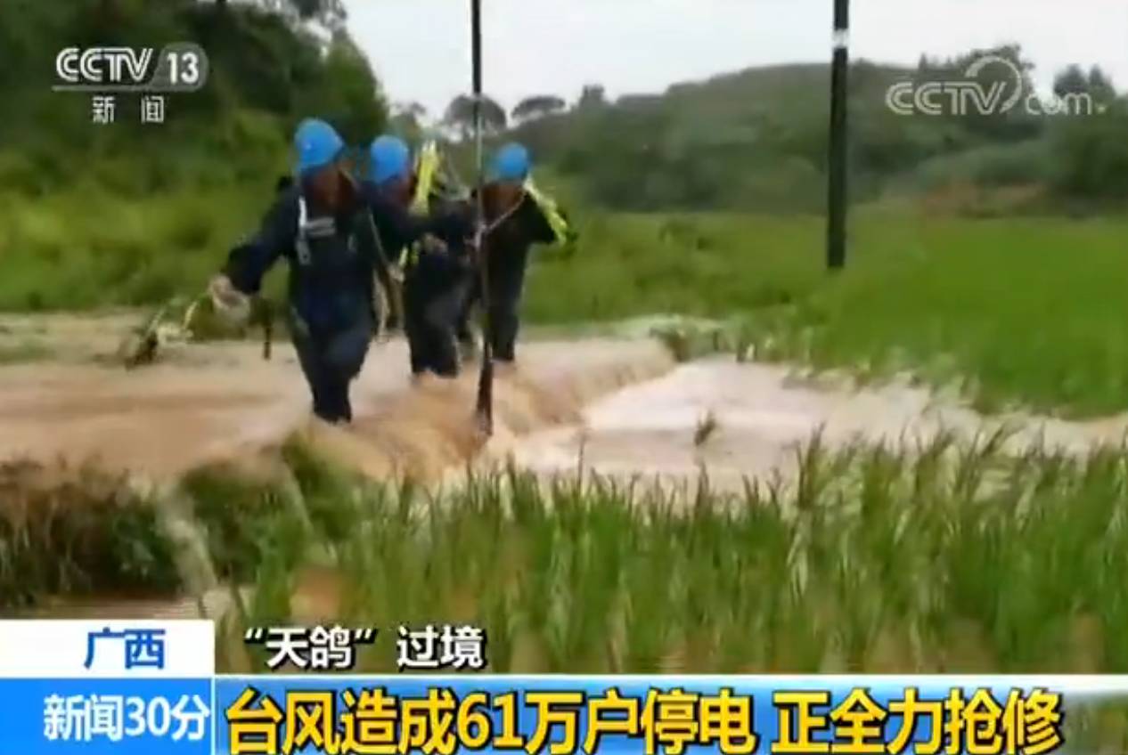 截至24日下午4点,台风“天鸽”已造成广西61.1万户居民停电。昨天上午,南方电网广西北海局迅速组织供电抢修人员对受损线路进行故障排查,为停电用户抢修复电。目前,广西电网已恢复全接线全保护运行,广西电网300条10千伏及以上线路、6721个台区以及34万受影响停电用户已恢复供电,预计25日将全部恢复供电。