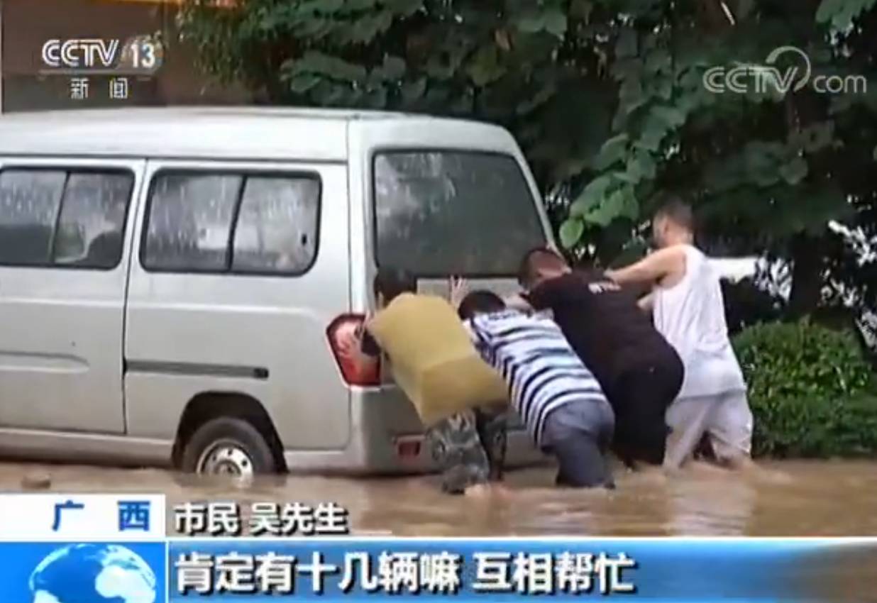 受“天鸽”的影响,昨天凌晨,广西贵港市城区也遭遇大风大雨天气,城区的荷城路、迎宾大道等路段出现积水,最深处超过30厘米,部分停在路边的车辆被浸泡在水中。24日早上,有群众自发来到这里,帮助车主把浸泡在积水中的车辆推到安全区域。