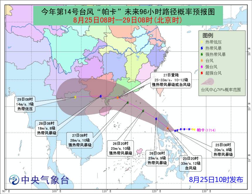 虽然“天鸽”刚过,但“帕卡”将至!中央气象台今天(25日)上午十点继续发布台风蓝色预警,今年第14号台风“帕卡”将于今天晚上在菲律宾吕宋岛东部沿海登陆,明天白天将移入南海东部海面,之后转向西北方向,预计后天在广东中部到海南东部一带沿海登陆,登陆风力为10到12级。
