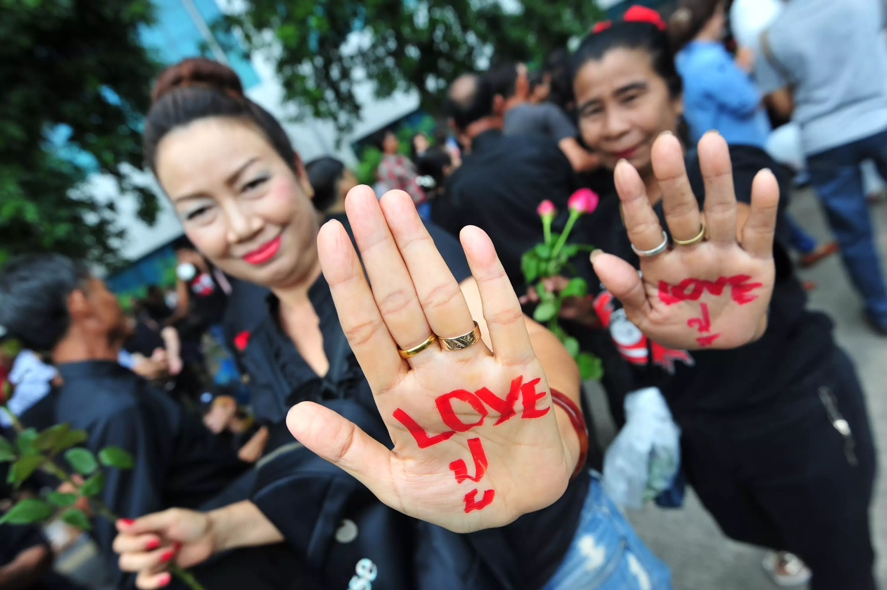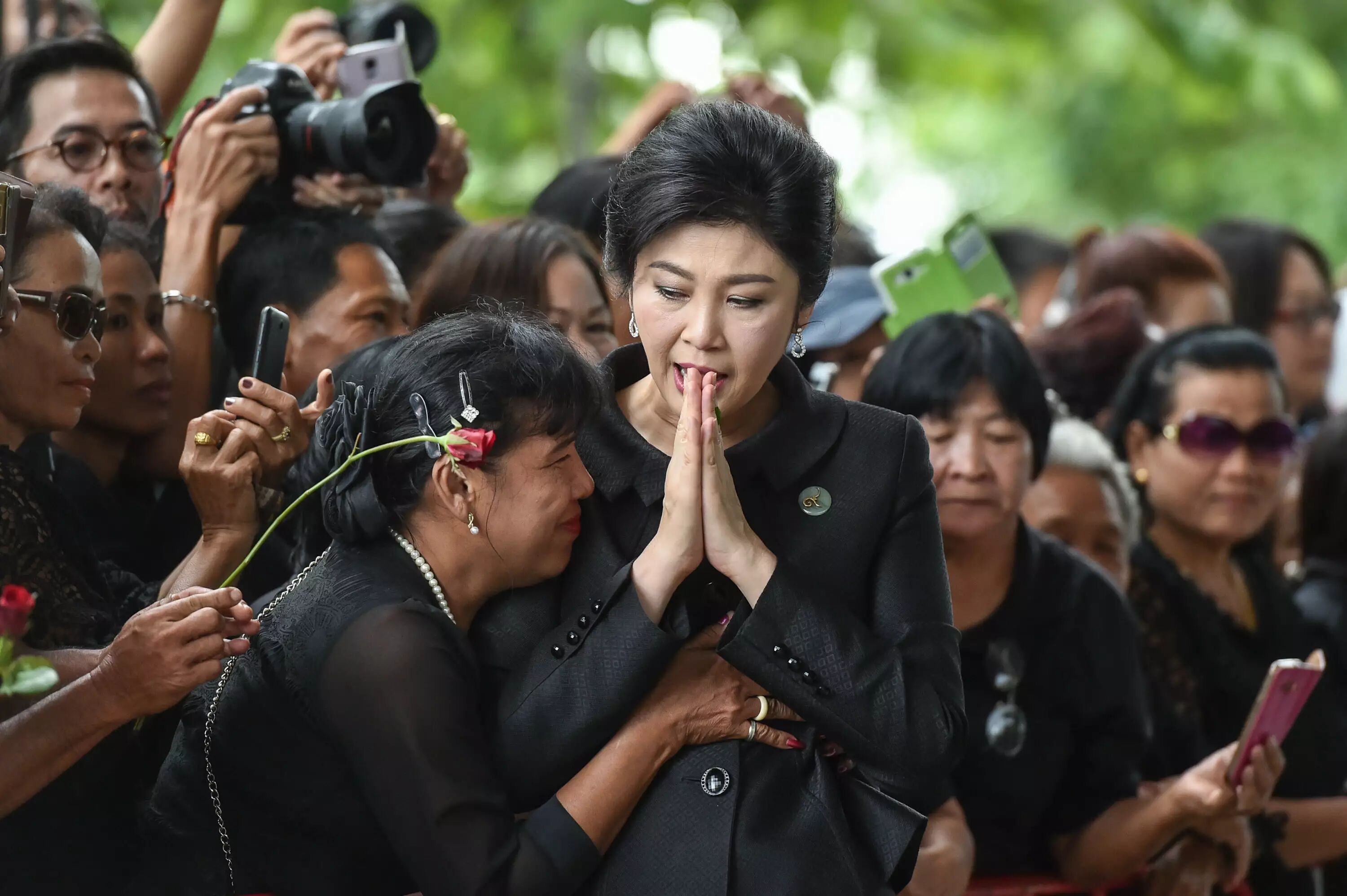 7月21日,在泰国最高法院外,支持者拥抱英拉
