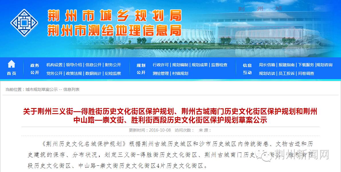 《荆州三义街一得胜街历史文化街区保护规划》、《荆州古城南门历史文化街区保护规划》和《荆州中山路一崇文街、胜利街西段历的晚清史文化街区保护规划》草案,正向社会进行公示,公示时间截至11月8日,有关单位或个人对规划草案有何建议,可向市规划局提出。
