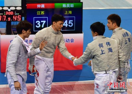 一金一铜,北京奥运会冠军仲满结束了他的全运征程。9月1日,惊险夺得第十三届全运会男子佩剑团体铜牌后,这位老将宣布正式退役。图为仲满(左二)参加当日的赛事。中新社记者 翟羽佳 摄