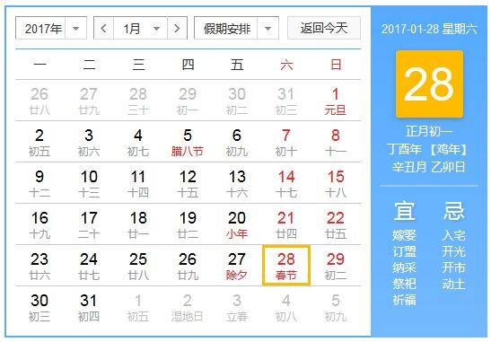 1月27日(星期五,农历除夕)、1月28日(星期六,农历正月初一)、1月29日(星期日,农历正月初二)为法定节假日