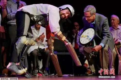 资料图:美国搞笑诺贝尔奖颁奖仪式 男子戴假肢扮山羊领奖