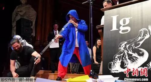 其实,搞笑诺贝尔奖自有一套“完整”的颁奖程序。与诺奖正装出席,并向瑞典王室敬礼不同,搞笑诺贝尔奖需在颁奖典礼中,向瑞典传统肉丸子敬礼,并可以穿上五花八门的服装参加。