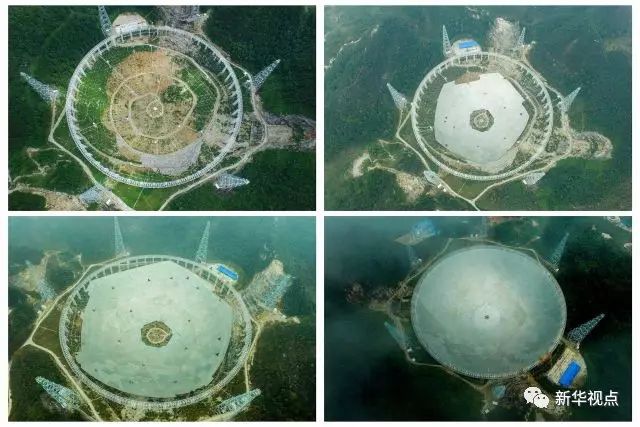 这是FAST项目从安装第一块反射面板到即将完成的过程(拼版照片)。左上为:FAST安装第一块反射面板(2015年8月2日摄);右上为:FAST反射面板安装近半(2015年12月16日摄);左下为:FAST反射面板安装近八成(2016年3月9日摄);右下为:FAST反射面板安装完成(2016年7月3日摄)。