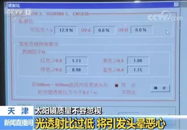 如遮阳镜三类产品,光透射比应该在8%到18%之间,但是经过检测,一款标称为“流星情缘”的太阳镜实测值只有4.3%~15.0%,不符合标准要求。检测人员告诉记者,日常环境中如果长时间佩戴这种光透射比过低的太阳镜会引发视觉疲劳,严重者可出现头晕、恶心等不适症状。