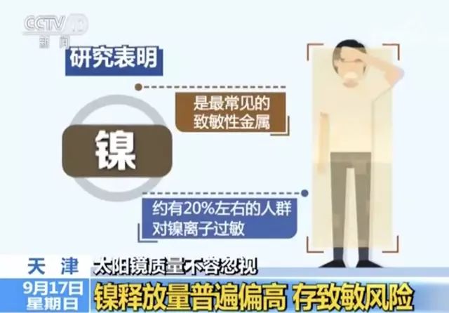 金属镍是日常生活中常见的一种元素,在制造合金首饰、太阳镜时适量添加镍可以增加首饰的光亮度,同时起到耐腐蚀的作用。但镍也是最常见的致敏性金属,约有20%左右的人群对镍离子过敏;在与人体接触时,镍离子可以通过毛孔和皮脂腺渗透到皮肤中,触发免疫系统中特殊蛋白质的免疫反应,从而可造成身体出现红肿、发痒、溃烂等过敏症状。