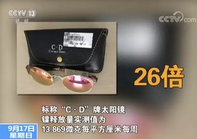 其次是标称“C·D”牌太阳镜镍释放量实测值为13.869微克每平方厘米每周,是参考限值的26倍;