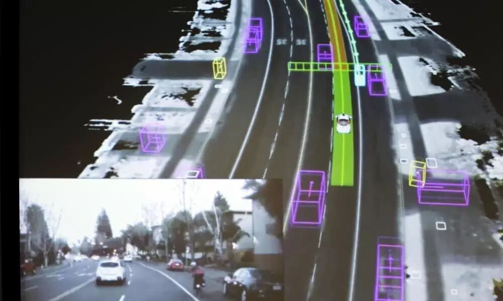 ▲下方小图是谷歌自动驾驶汽车拍摄的视频,大图则是汽车对同一街景进行的视觉化呈现。