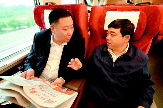 图为:15日,出席党的十九大的湖北代表乘坐高铁赴京。