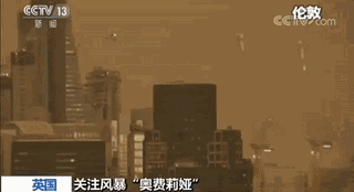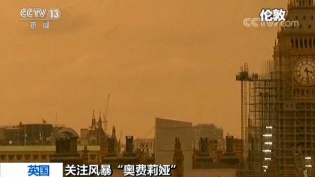 当天,在英国首都伦敦,风暴“奥费莉娅”登陆后不久天空就变成了一片昏黄。伴随着风暴而来的,是大量来自北非撒哈拉沙漠的扬尘和欧洲南部西班牙、葡萄牙山火产生的浓烟,大量沙尘和烟雾弥漫将伦敦上空的日光遮蔽得十分严实。