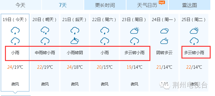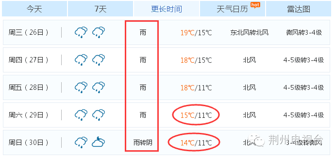 荆州气象台刚刚发给小荆的消息:预计,从今晚开始,将会迎来新一轮降水,未来3天都将维持雨水天气,气温也会随之下降,高温是在20-23℃之间。