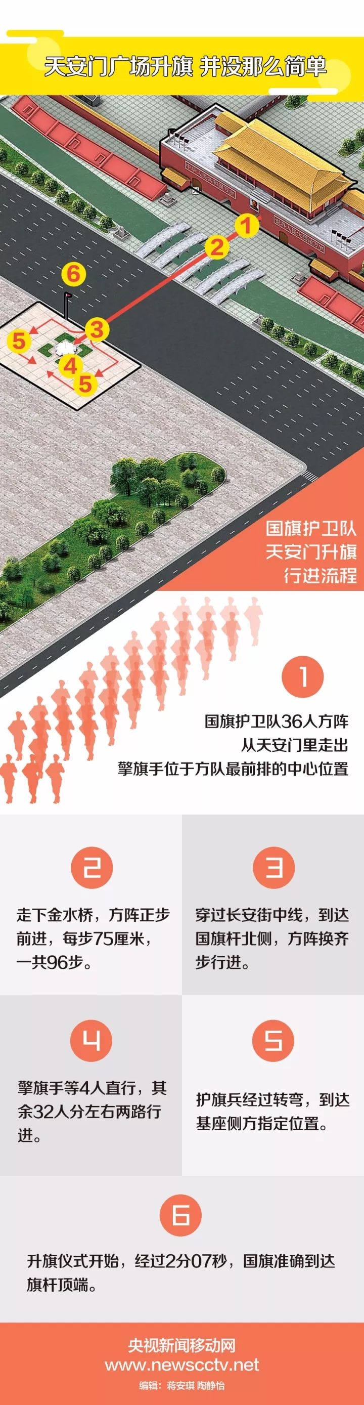 近日,天安门国旗护卫队的36名战士完成了“两个一百步”精准挑战——他们从金水桥起点出发,以每步75厘米的步幅,首先进行一百步正步走,然后变换为齐步走,再行进一百步。两百步结束以后,32名国旗护卫队的队员,在国旗杆南侧的32个终点站位处站定并且全部对位精准。