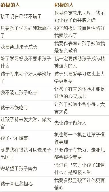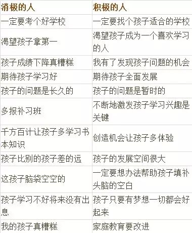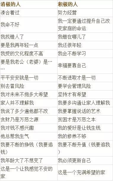 思维决定命运,思维决定心态,思维决定教育方式,思维影响孩子的前途。一个人在原生家庭中继承和熏陶的最重要的是思维方式。积极思维的人容易培育出积极思维的孩子,消极思维的人,容易造就消极思维的孩子。下面我们就来看看消极的人和积极的人他们的思维方式有何不同?